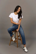 • A mid-high rise, straight leg jean with 7/8 length.