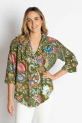 The LulaLife Nandita Shirt in Olive is a vibrant wardrobe staple designed for effortless style and comfort. Crafted from 100% breathable cotton, this relaxed-fit shirt features a striking digital print in bold ocean tones with pops of floral and paisley accents. The flattering V-neckline, button-through front, and curved hemline create a versatile silhouette that can be worn loose or tucked in.